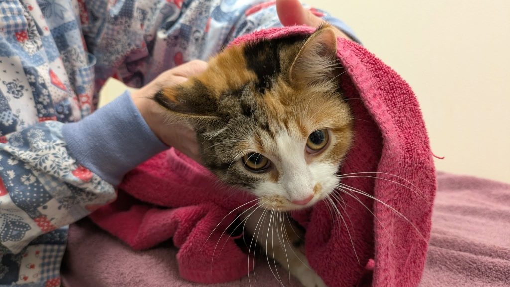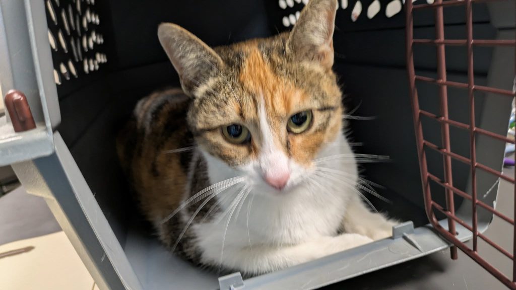 Found deceased gray and white tiger adult female cat on Indian Point Road near Sherman Road intersection – finder said cat was not in road at 5 pm yesterday but when returning from errands cat was in road deceased at approx 8 pm.