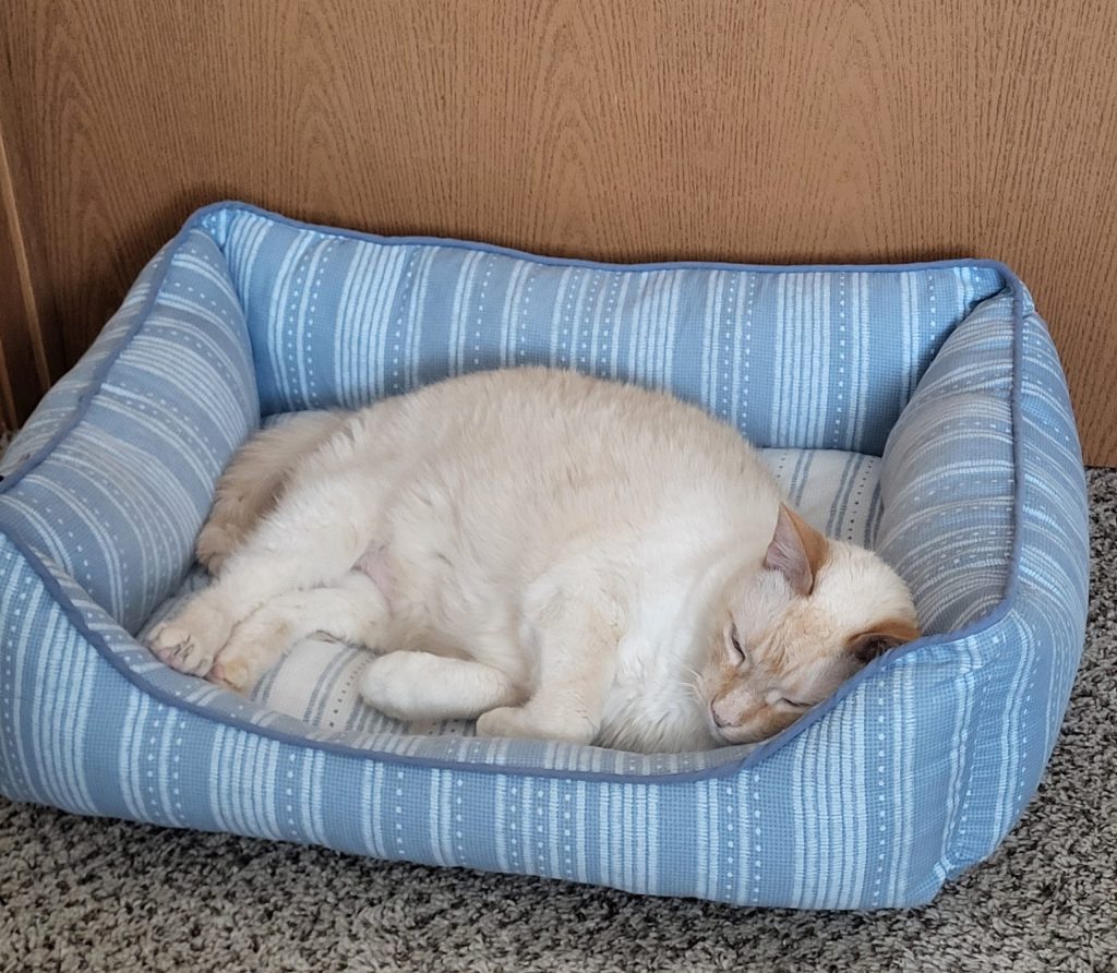 Playing with string toys & likes a bit of catnip sometimes. Eats Fancy feast. Prone to vomiting if eats too much, limit to 3 oz at one time, wet Fancy feast size. drinks tap or bottled filtered water, but not spring water such as Evian or FIJI.